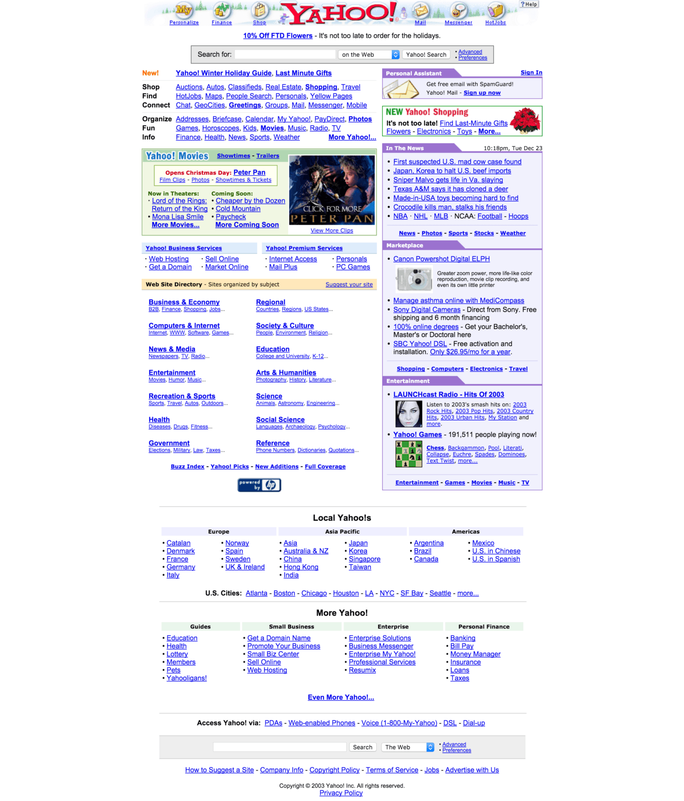 Yahoo's web directory links were pushed well down and the primary focus seemed to be on Yahoo Movies and Yahoo Mail(well distinguished from the other content on the page) with Yahoo's diversity expanding to entertainment news. Yahoo might have begun to understand the importance of search as it continued to appear on the top of the page, below the logo and appeared well defined on the page.
